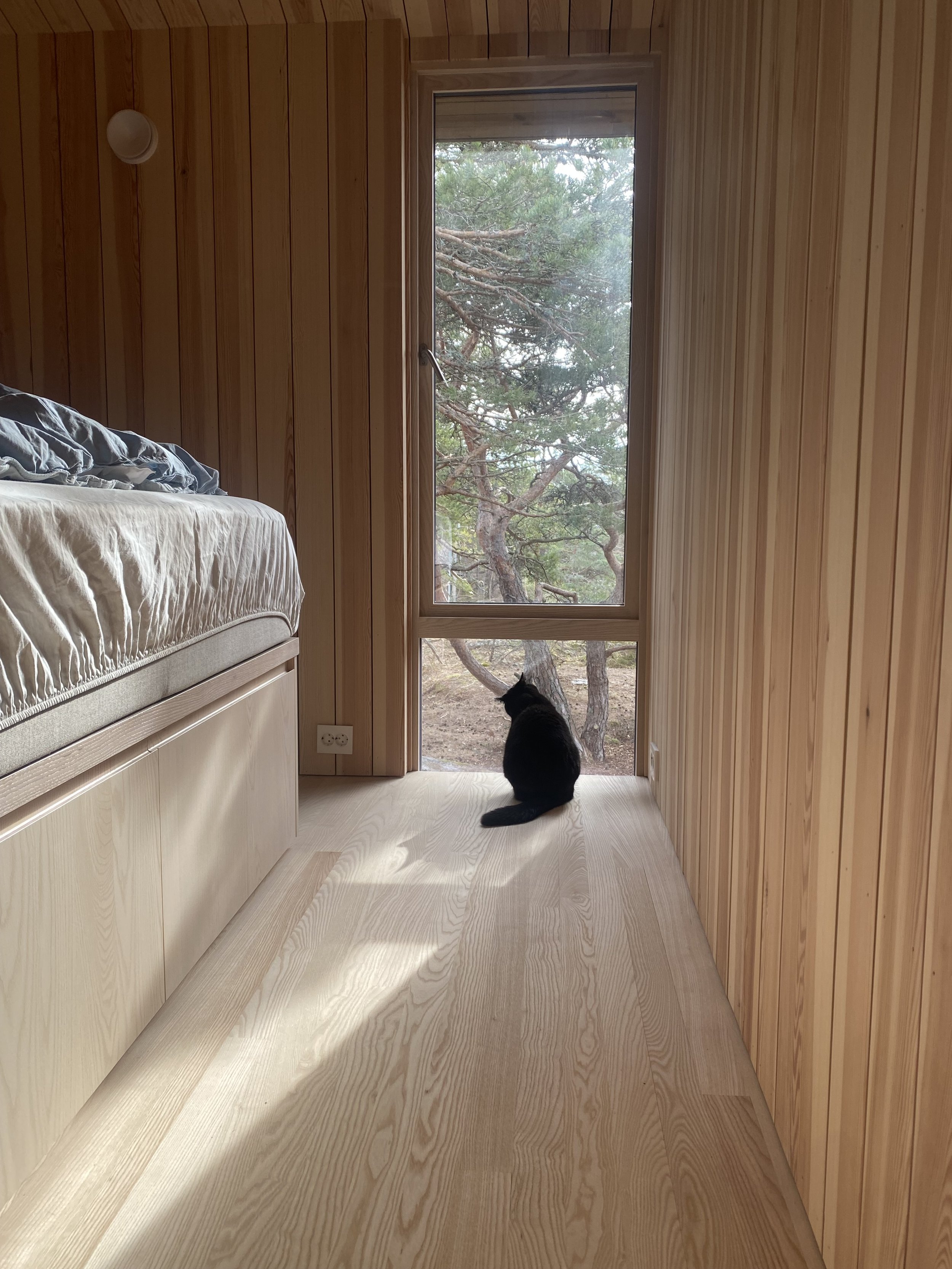 Hytta har en fantastisk plassering med utsikt mot havet og skogen. Viktige føringer for prosjektets størrelse og plassering har vært ønsket om å påføre terrenget minst mulig inngrep, gjennom plassering av tilbygget i naturlige lommer i landskapet og fundamentering på påler.